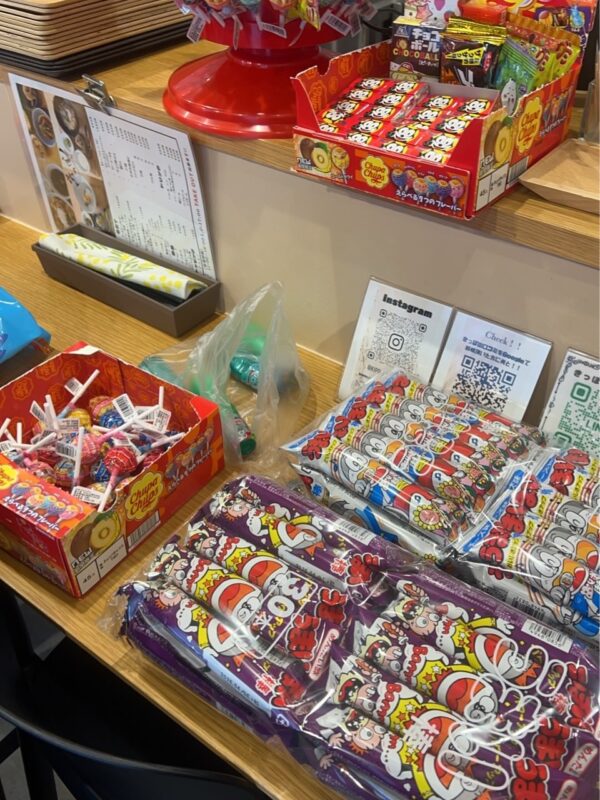 チュッパチャプスやうまい棒、チョコボールなど、色とりどりのお菓子がずらり。