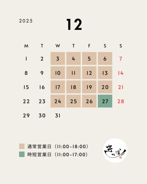 12月も引き続き、水曜日〜土曜日の営業となります。