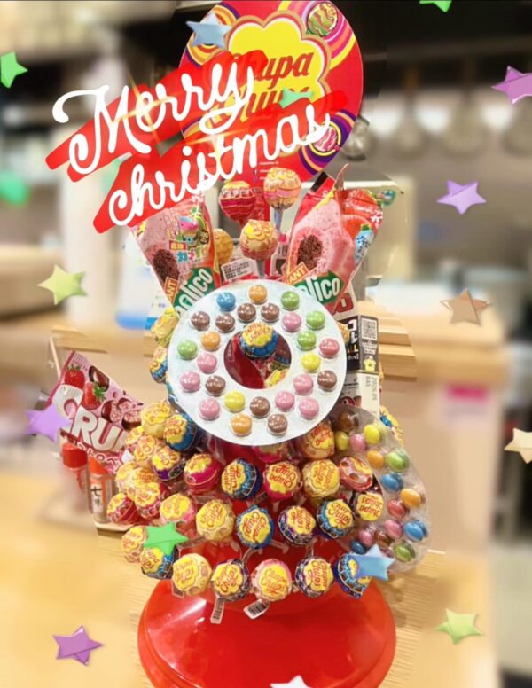 チュッパチャプスやいろいろなお菓子がたくさん詰まった、見ているだけで楽しくなるツリーです。